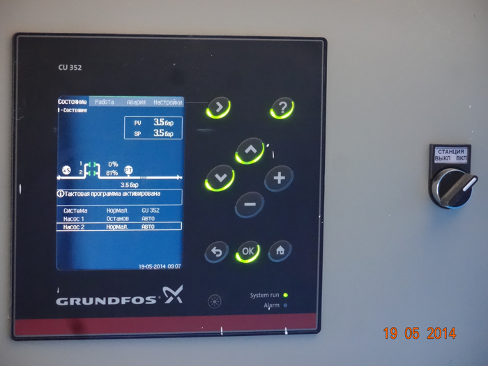 -компьютер арқылы диспетчерлендіруге арналған дабылды шығару мүмкіндігі бар, дабыл бойынша бірдей қысым датчигі арқылы қысым жүйесін басқаруға арналған түрлі-түсті сенсорлық дисплейлі Grundfos бақылаушысы;